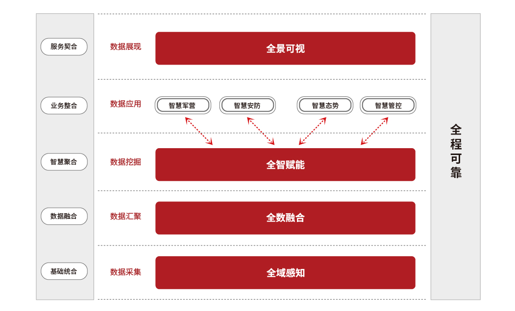智慧軍營建設是以“三融五跨”為指引,以數據資源為核心,促進軍隊業務管理方式轉型升級的新路徑、新模式、新形態。 理念上要新,更加注重以人為本 / 機制上要新,更加注重統籌協調 / 監管上要新,更加注重安全可控